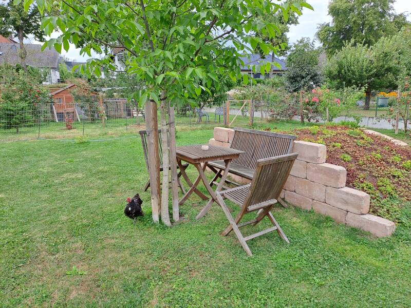 Dazu steht bei Bedarf ein Therapiegarten mit Hochbeet zur Verfügung, in dem auf Wunsch auch acht zahme Hühner auf Sie warten. Die Tiere sind als Medium bei Bedarf ein wichtiger Bestandteil meiner Therapie.